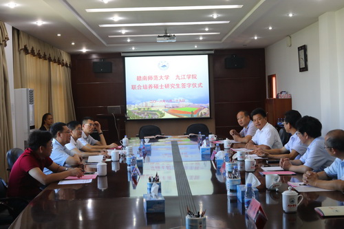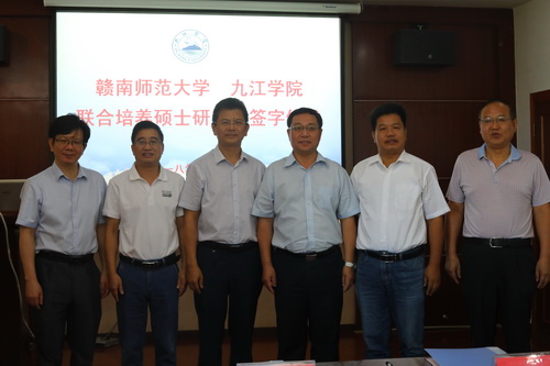 8月29日上午,赣南师范大学与九江学院联合培养硕士研究生签字仪式在我校行政楼党委会议室举行,赣南师范大学校长范小林、副校长罗序中,我校校长刘晓东、副校长王万山、副校长陈春生出席仪式,两校相关部门负责人参加了仪式。