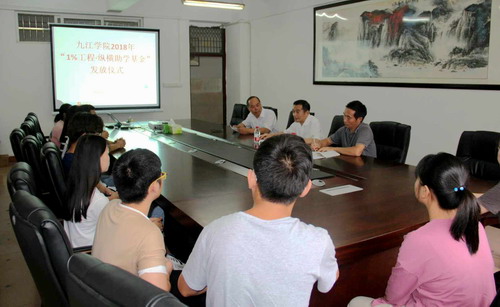 9月12日下午, 2018年度“1%工程·纵横助学基金”发放仪式在我校竞知楼412会议室举行。党委委员、统战部部长刘遵海,学生资助管理中心主任潘建华和本次受到资助的学生出席发放仪式。仪式由民进九江市委会副主委、九江学院总支主委赵追主持。
