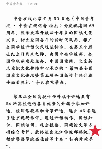 据悉,为深入贯彻落实习近平新时代中国特色社会主义思想和党的十九大精神,加强“国旗法”、“国歌法”教育,持续发挥升旗仪式的教育引导作用,在青年学生中深化社会主义核心价值观和爱国主义教育,培育学校思想引领工作新品牌,团中央学校部于8月创建遴选活动,活动面向全国高校升旗手,此活动最终确定全国46名升旗手进京参赛。