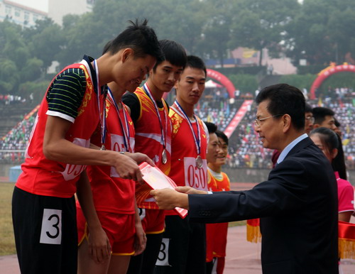 在两天半的运动会比赛中,南区田径场上彩旗飘飘、欢呼如潮,到处洋溢着青春气息与火热激情。10月20日上午,随着径赛最后一场学生男子4×400接力赛决赛的结束,运动会所有竞赛项目已圆满完成,我校第十七届运动会胜利闭幕。