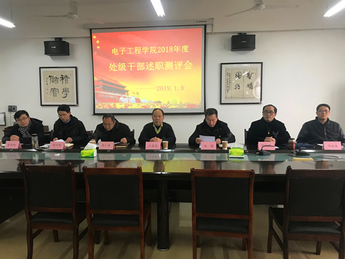 会上,电子工程学院党委书记孙小明代表学院党委领导班子做了学院党委2018年度工作总结及个人述职,电子工程学院院长高小英代表学院行政领导班子做了2018年度行政工作总结及个人述职。随后,副院长胡日新、杨长春分别就各自分管的工作从德、能、勤、绩、廉、法等方面做了述职报告。全体教职工在听取每位处级干部述职后,认真填写了测评表。
