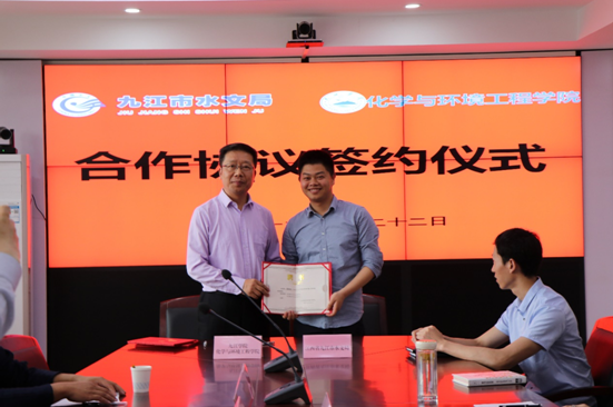 签约仪式上,曹小华副院长和黄良保副局长分别代表双方共同签订了《九江市水文局与九江学院化学与环境工程学院合作框架协议》,同时还举行了实习基地的授牌仪式及兼职教授的聘任仪式。双方表示将本着“优势互补、平等合作、互惠互利、共同发展”的原则,充分发挥市水文局在监测能力、成果转化的优势与化环学院在人才队伍、科研方面的优势,共建平台、共享资源、共同发展。