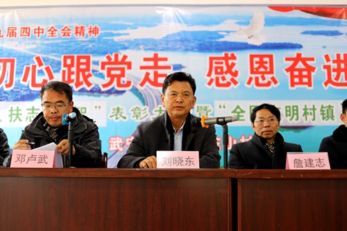 12月19日,在全省上下深入开展“扶德扶志、感恩奋进”主题活动之际,校长刘晓东在院办负责同志等陪同下,来到学校扶贫点武宁县官莲乡东山村出席“扶德、扶勤、扶志、扶智”表彰大会暨“全国文明村镇”创建启动仪式。武宁县委宣传部、县文明办有关负责同志、驻村工作队全体成员、乡村干部及村民代表共计150余人参加了活动。活动由官莲乡党委副书记、乡长邓卢武主持。