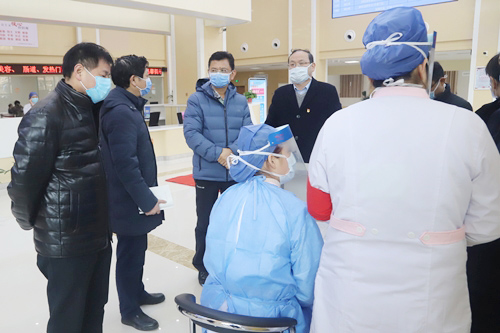 随后刘晓东在附属医院党政班子成员张南华、殷小平、贾宗林、胡志坚等陪同下,查看了医院发热患者就诊流程及路线,并检查了发热门诊标志标识及医护人员防护情况。在新门诊楼分诊处,刘晓东亲切问询了导诊的工作状况,叮嘱导诊一定佩戴好护目镜和手套,注意自身健康安全防护。他指出,分诊处是发热病人在附属医院诊疗的第一站,导诊要把好关,对每一个进入医院的人员都要做好体温筛查工作,加强对患者的早期识别。