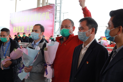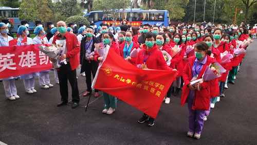 3月22日12时11分,由九江学院附属医院25名医生和60名护士组成的江西省第九批驰援武汉的重症医疗队队员们乘坐高铁平安抵达庐山站,同车到达的还有省荣军医院支援湖北医疗队及省支援湖北医疗队一名领队。校党委书记赵伟、校长刘晓东和副校长杨耀防满怀热切的期盼和激动的心情,在出站口等待着英雄们的凯旋。队员们一出站口,现场工作人员立即给队员们送上了鲜花,送上全市人民对他们的诚挚祝福。