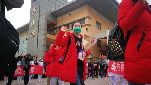 经过昨夜一场大雨的洗礼,庐山站显得格外清秀。站前小广场上,“致敬江西援鄂医疗队,家乡人民以你们为傲”、“临危请缨热血逆行,舍身战疫英雄凯旋”的大红横幅和标语格外引人注目;自发前来迎接的市民有序地环绕着他们,“你们辛苦了”,“欢迎英雄回家”的话语表达着家乡人民朴素的牵挂和思念,简朴而隆重的欢迎仪式正在这里举行。