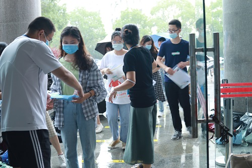 一大早,刘晓东一行冒雨来到香远楼考点,检查考生现场身份审核情况,认真听取教务处负责同志对考务、疫情防控、后勤保障等工作的汇报。考试期间,刘晓东、陈春生一行来到考场监控室,通过视频查看考场整体情况,要求工作人员认真履职,及时发现汇报处理突发事件;深入考区教室逐一巡视,检查考场纪律、教师监考等情况。