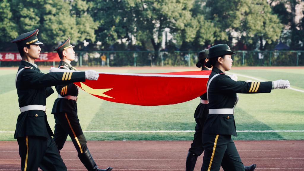 入场式结束后,国旗班的同学们迈着矫健整齐的步伐走向升旗台,在庄严的国歌声中,在全体师生的注目礼下,五星红旗冉冉升起,飘扬在学校的上空。