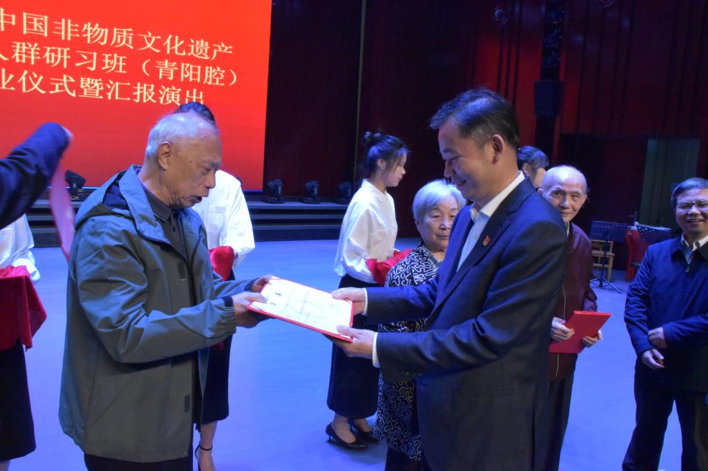 结业仪式结束后,学员还进行了精彩的汇报演出。演出内容有锣鼓演奏,《百花记•百花赠剑》选场、《贵妃醉酒》《金锁记·斩娥》《玉籍记·夜等》等青阳腔传统剧目,青阳腔曲牌《红纳袄》男声表演唱。节目异彩纷呈,让观众领略到了传统青阳腔戏曲艺术的蓬勃生命力,赢得了观众的一致好评,全场掌声不断。