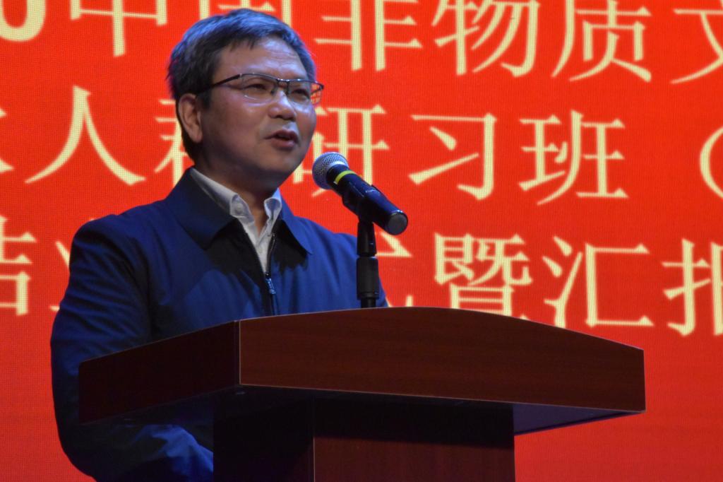查振华代表学校致辞。他向实现预期学习目标的学员表示祝贺,向授课专家致以诚挚敬意,向给予大力指导和关心的省文旅厅及九江市相关单位表示衷心的感谢。他表示,近年来,九江学院深入贯彻党的文艺方针,继承发扬优良传统,紧跟时代前进步伐,大力开展传统文化艺术研究和教育。江西省第一个非物质文化遗产研究基地和“江西省文化艺术科学重点研究基地”先后落户我校艺术学院,建立了“青阳腔戏曲艺术中心”“青阳腔戏曲艺术教学实践基地”,组建了九江学院青阳腔艺术团,创建了九江学院非物质文化遗产陈列馆。2020年,我校被列入中国非遗传承人群研培计划参与院校名单,为江西省五所入选的高校之一。举办本期研培班,旨在以党的十九大精神为指引,学习贯彻新时代社会主义文艺思想,更好地保护传承国家级非物质文化遗产青阳腔,培养一批优秀的中青年传承人,让这一文化瑰宝在新时代创新性继承发展。