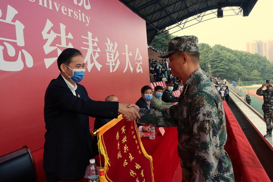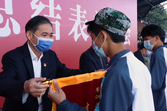大会宣布了军训会操和内务评比结果,学校领导和九江军分区领导给获奖班级颁发了锦旗。