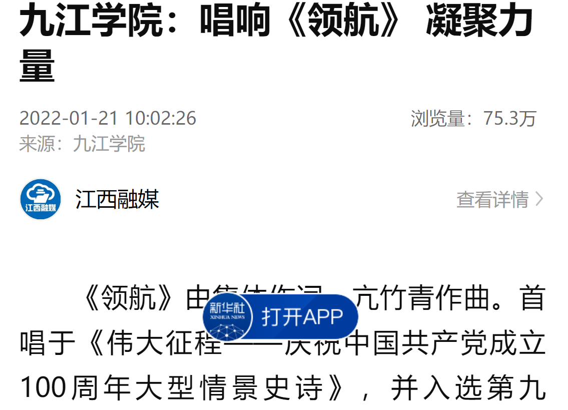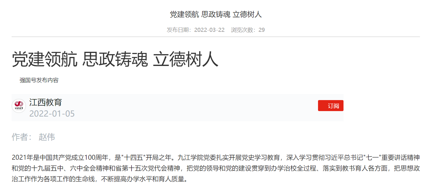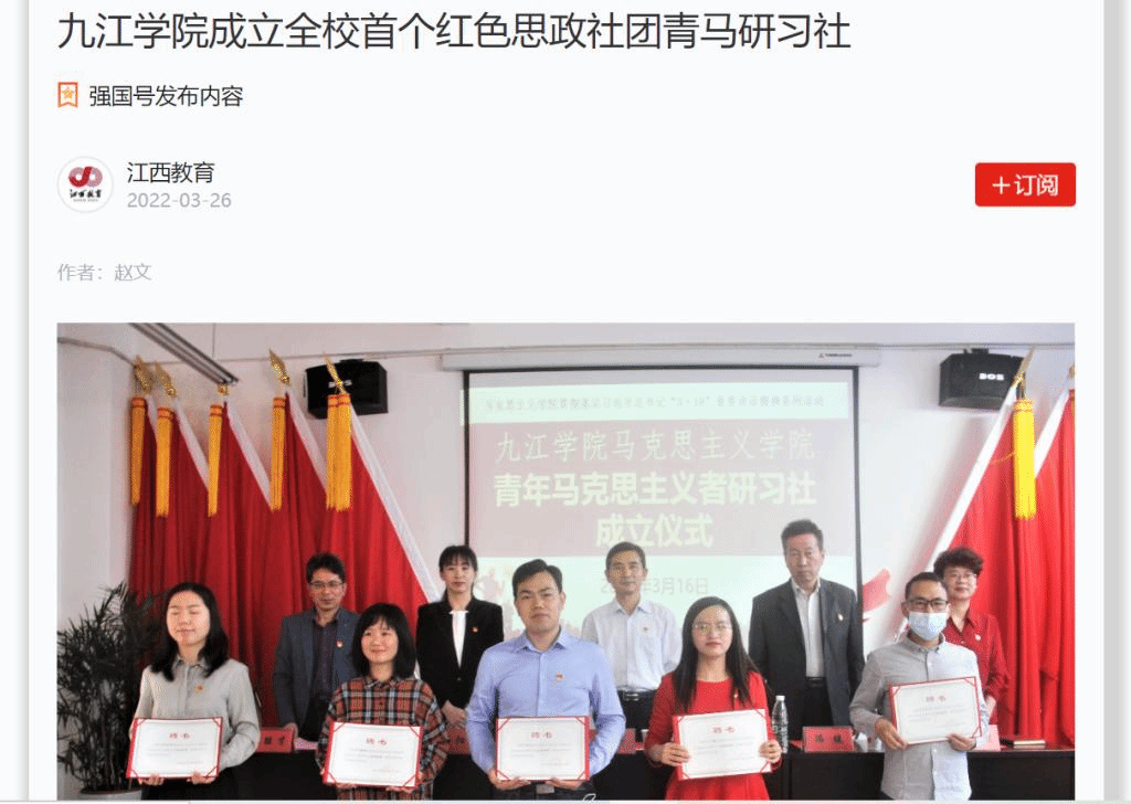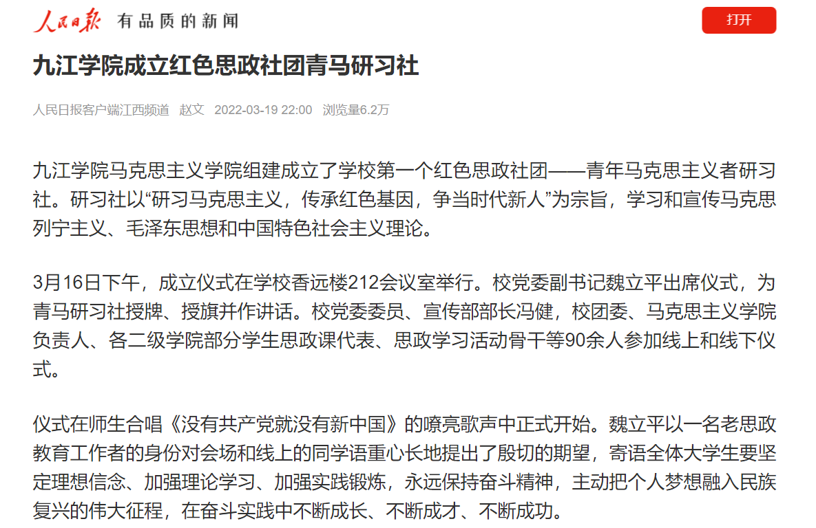 上半年以来,人民日报、新华社、新华网、学习强国、中国教育新闻网、江西思政、掌中九江等媒体以《九江学院成立红色思政社团青马研习社》《九江学院:“声”入人心,凝聚奋进力量》《九江学院|党史学习教育再出发》《让思想政治教育“活”起来》为题,深入报道我校深入推进党史学习教育,建立常态化、长效化制度机制,不断巩固拓展党史学习教育成果的做法。综合浏览量达10万次以上。