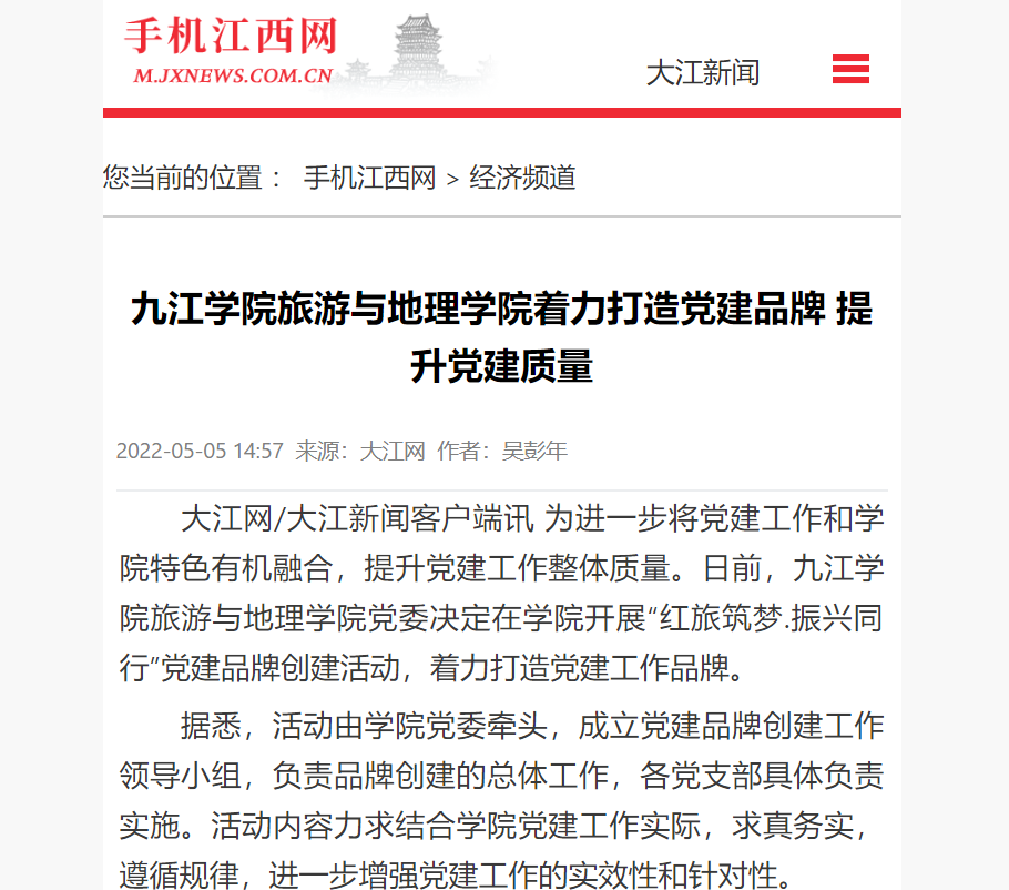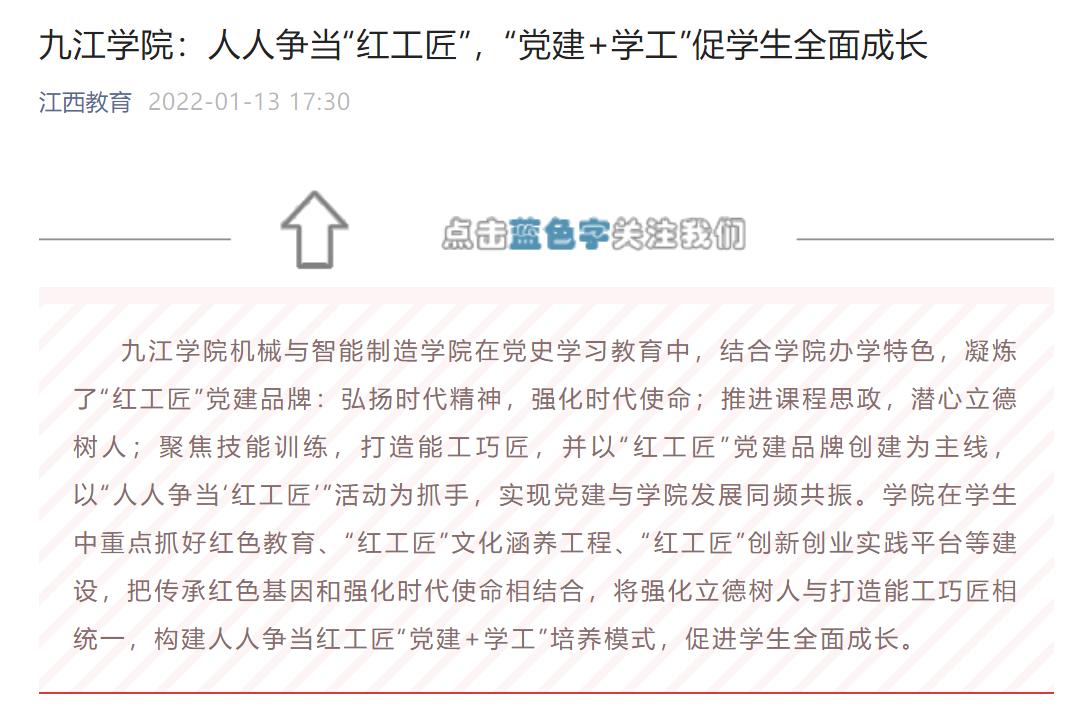 学习强国、江西日报、大江网、江西教育、江西思政等媒体以《党建领航 思政铸魂 立德树人》《九江学院旅游与地理学院着力打造党建品牌提升党建质量》《九江学院:人人争当“红工匠”,“党建+学工”促学生全面成长》《九江学院机械与智能制造学院:构建人人争当红工匠“党建+学工”育人模式,促进学生全面成长》等为题,重点报道了我校加强基层党组织建设,抓好学生红色教育、构建人人争当红工匠“党建+学工”培养模式,争创思政工作特色品牌,促进学生全面成长等方面的经验做法。