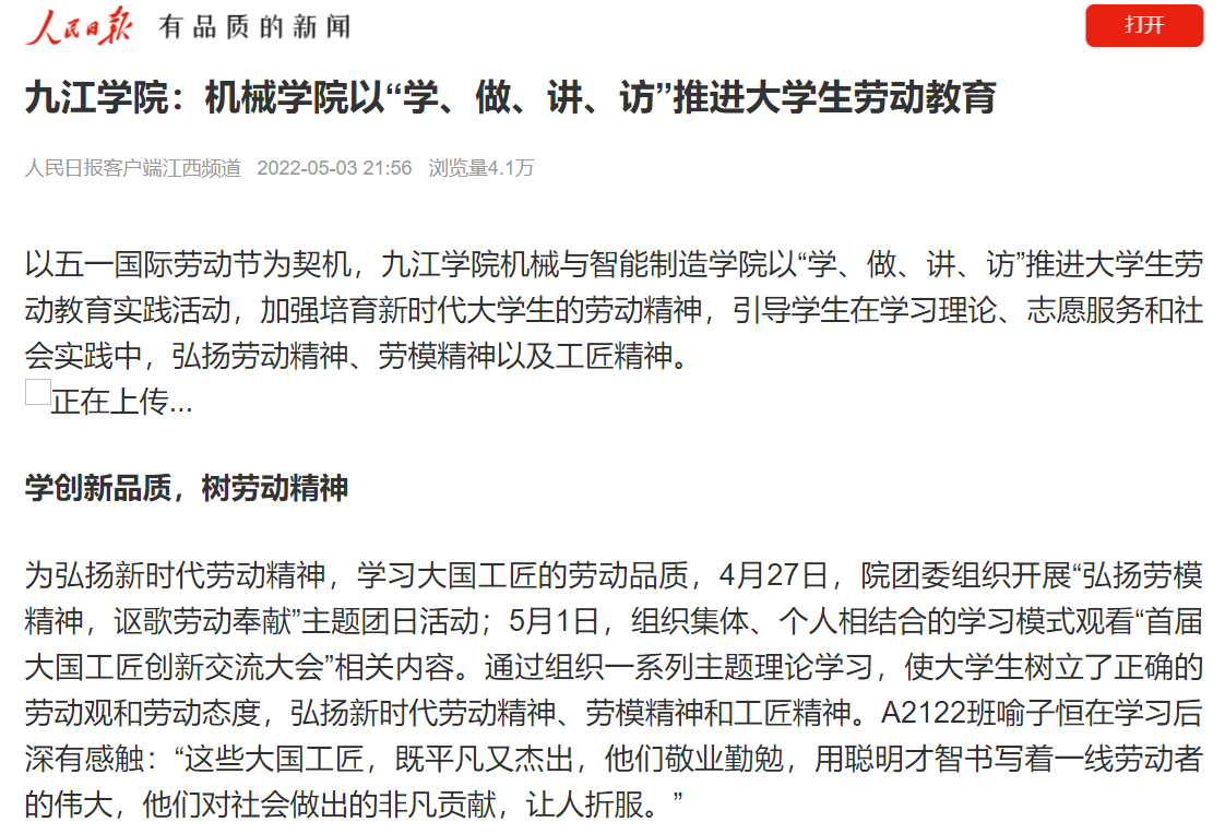 以五一国际劳动节为契机,我校加强培育新时代大学生的劳动精神,努力引导学生在学习理论、志愿服务和社会实践中弘扬劳动精神、劳模精神以及工匠精神。近几个月来,人民日报客户端以《九江学院:机械学院以“学、做、讲、访”推进大学生劳动教育》为题,报道我校努力推进大学生劳动教育实践活动落地生根,积极培育新时代大学生劳动精神,展现新时代大学生青春劳动风采。浏览量次数达4.1万次数。