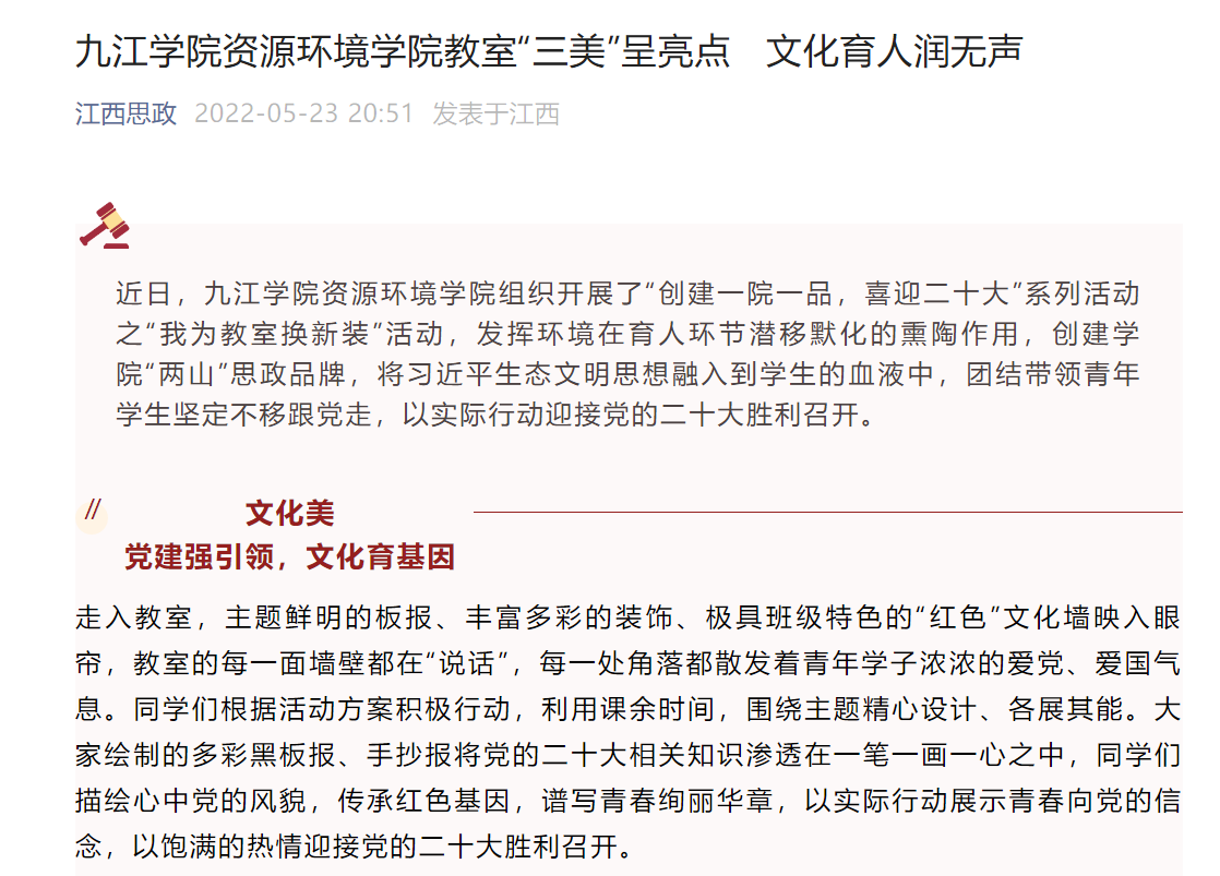 人民日报以《九江学院护理学生手舞<雪龙吟>》上好开学冬奥思政课》为题,浏览量达5.9万次数以上,报道我校护理学院为团结带领广大青年牢记党的教诲,立志民族复兴而开展的主题活动;江西思政以《学九江青年运动史传承江西红色基因——九江学院外国语学院举行党领导的中国青年运动史专题学习活动》《九江学院药生学院“青春心向党,喜迎二十大”博莱杯文体活动圆满收官》《九江学院资源环境学院教室“三美”呈亮点 文化育人润无声》和大江网以《九江学院资源环境学院教室“三美”呈亮点 文化育人润无声》为题,展现出我校引领青年学生坚定跟党走的信念,迎接二十大的胜利召开的各项校园文化活动。