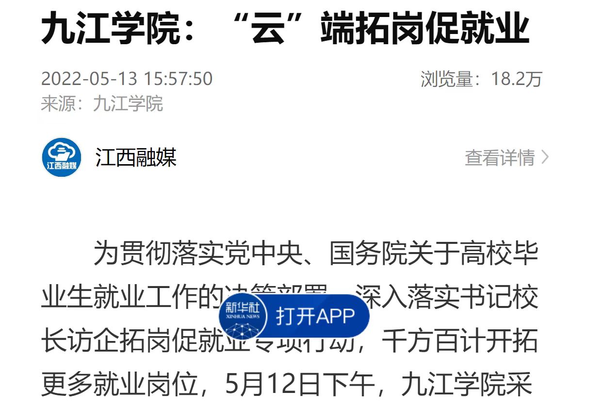 5月12日,我校采用云端会议的方式举办九江学院书记、校长访企拓岗促就业专项行动云端推介会。连续几日,人民日报以《九江学院:书记校长齐行动,云端拓岗促就业》为题,客户端平台上浏览量达2.9万次;中国教育发布、新华网、江西教育电视台以《九江学院云端促就业》为题,报道我校深入落实书记校长访企拓岗促就业专项行动,千方百计为大学毕业生开拓更多就业岗位,不断提升服务地方经济社会高质量发展能力。