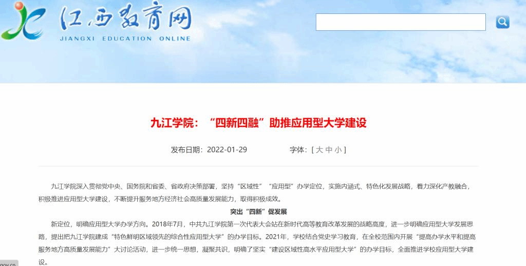今年1月,学习强国、江西教育网以《九江学院:“四新四融”助推应用型大学建设》为题,深入报道了我校深入贯彻党中央、国务院和省委、省政府决策部署,坚持“区域性”“应用型”办学定位,实施内涵式、特色化发展战略,着力深化产教融合,积极推进应用型大学建设等基本情况。