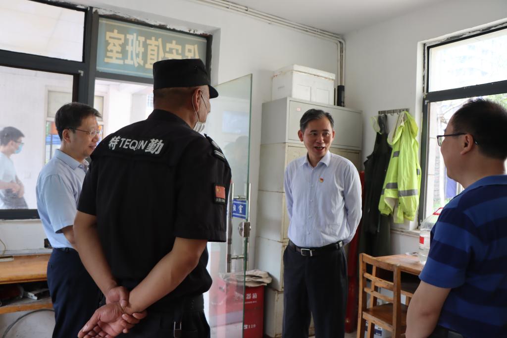 6月3日,正值端午佳节,校党委书记赵伟深入校园安保监控室、南大门、学生宿舍和工地一线等处,巡查指导假期安全稳定工作,看望慰问一线工作人员和在校学生。副校长严平参加巡查。