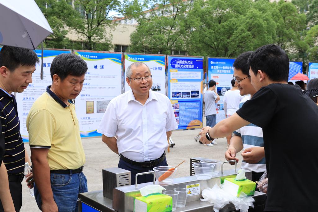 赛前,学校举行了2022年创新创业实践成果展暨项目推介会,50项总决赛参赛项目全部参展。周洛宏等总决赛评委观展并听取项目团队推介项目成果,为下午总决赛路演和答问环节提供了参考。