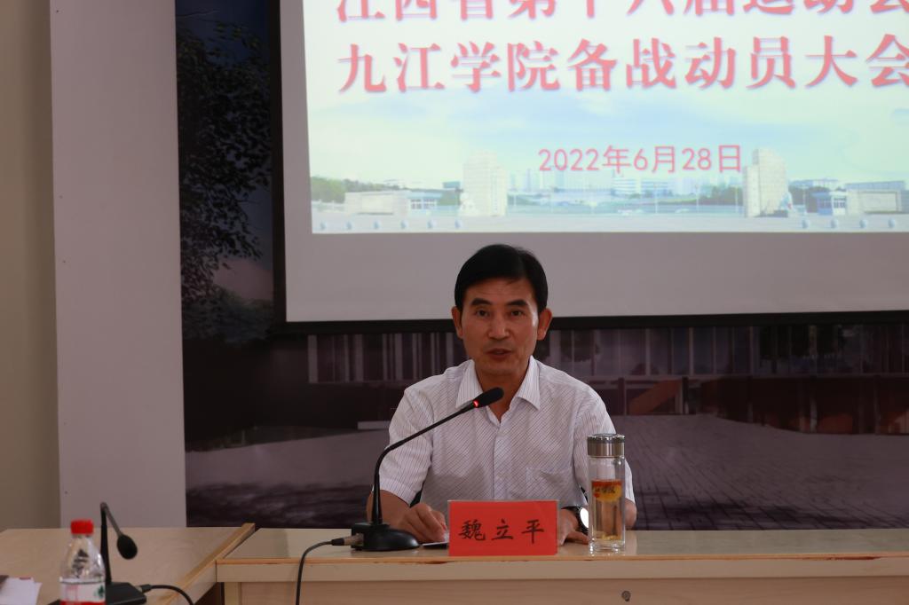 为迎接江西省第十六届运动会的顺利举行,动员九院运动健儿迅速进入临战状态,以饱满的激情、科学的态度、扎实的作风,备战省运会,力争新突破,全面展示新时代九江学院师生的风采,6月28日,我校举行第十六届省运会备战动员大会。校党委副书记魏立平出席会议并作动员讲话。副校长陈春生主持会议。