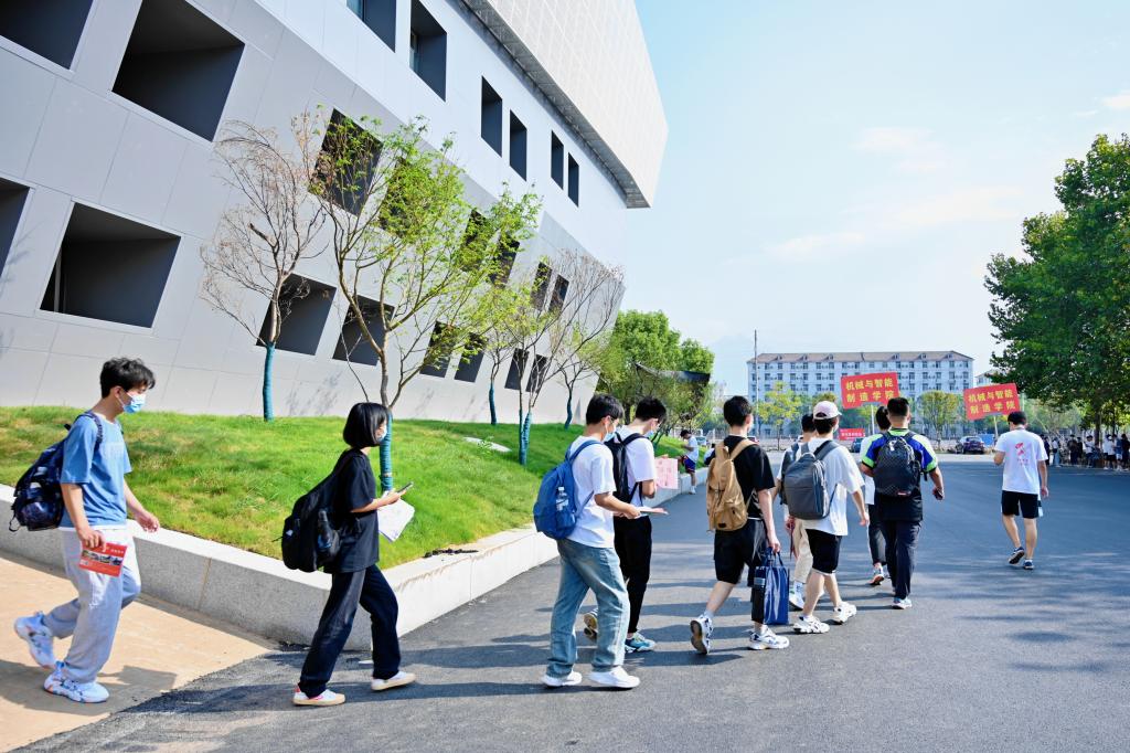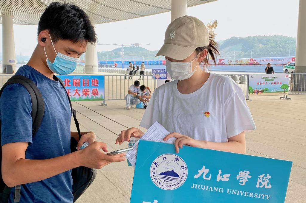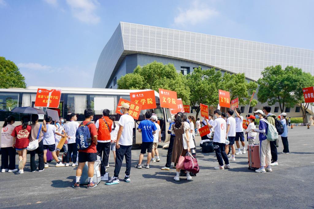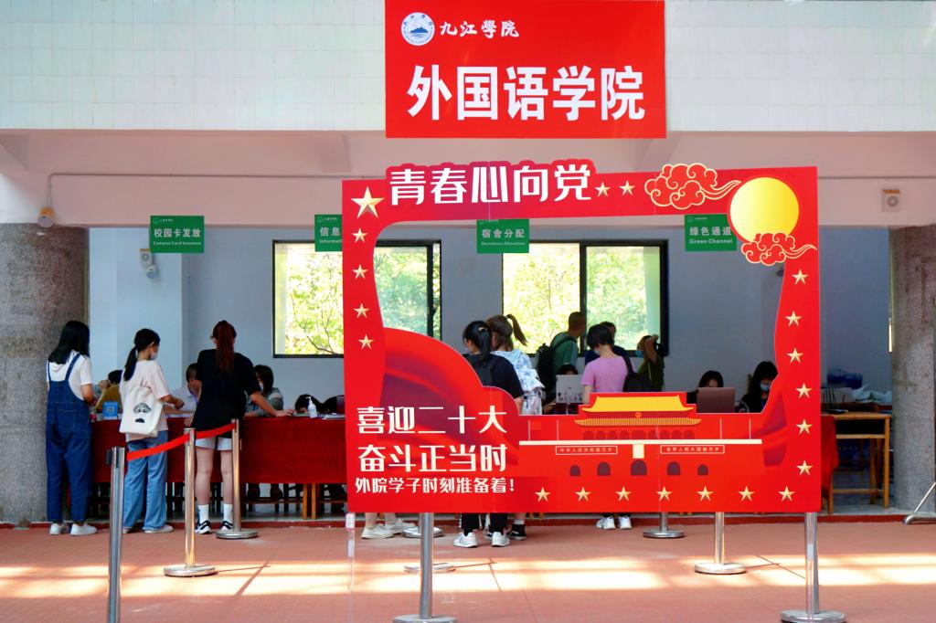 一群群朝气蓬勃的新生从校车下来,与现场热烈的“迎新气氛组”撞个满怀。鲜红色的拱门上写着“九江学院热烈欢迎2022级新同学”,体育训练中心外五颜六色的迎新彩旗高高挂起。