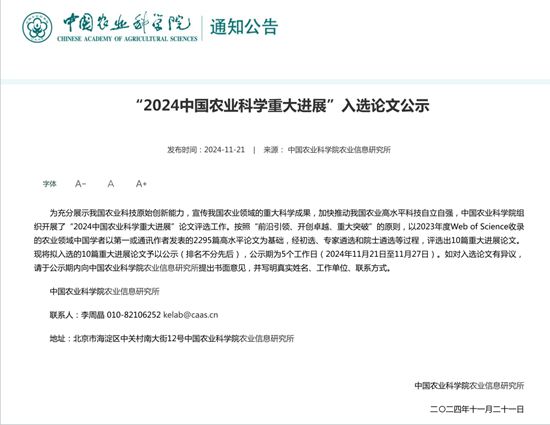 为充分展示我国农业科技原始创新能力,宣传我国农业领域的重大科学成果,加快推动我国农业高水平科技自立自强,中国农业科学院组织开展了“2024中国农业科学重大进展”论文评选工作。此次评选按照“前沿引领、开创卓越、重大突破”的原则,以2023年度Web of Science收录的农业领域中国学者以第一或通讯作者发表的2295篇高水平论文为基础,经过初选、专家遴选和院士终审等环节,最终遴选出10篇能够充分代表2023年我国农业科技前沿、取得突破性进展的基础性研究成果。2024年12月,这些成果将以中国农业科学重大进展的形式,在《2024中国农业科技发展论坛暨全球农业研究热点前沿与科技竞争力成果发布会》上面向全球发布。