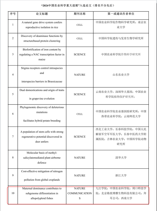 近日,经过初选、专家评审、院士终审等多轮严格筛选,我校药学与生命科学学院张化浩、张小谷教授领衔的鲤科重要经济鱼类保护及开发研究团队,在《Nature Communications》期刊发表的研究成果 Maternal dominance contributes to subgenome differentiation in allopolyploid fishes(成果链接:https://www.nature.com/articles/s41467-023-43740-y),成功入选2024年中国农业科学十大进展。这一成果是2023年10篇代表我国农业科技前沿和重大突破的研究成果之一,充分展现了我校在鲤科鱼类基因组进化与物种多样性研究领域的深厚底蕴和优异成就,更标志着我校在该领域的研究已迈入全国领先行列。