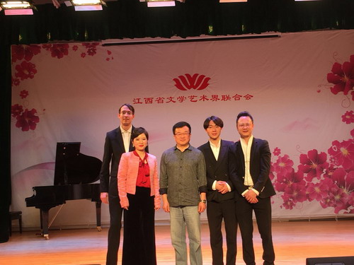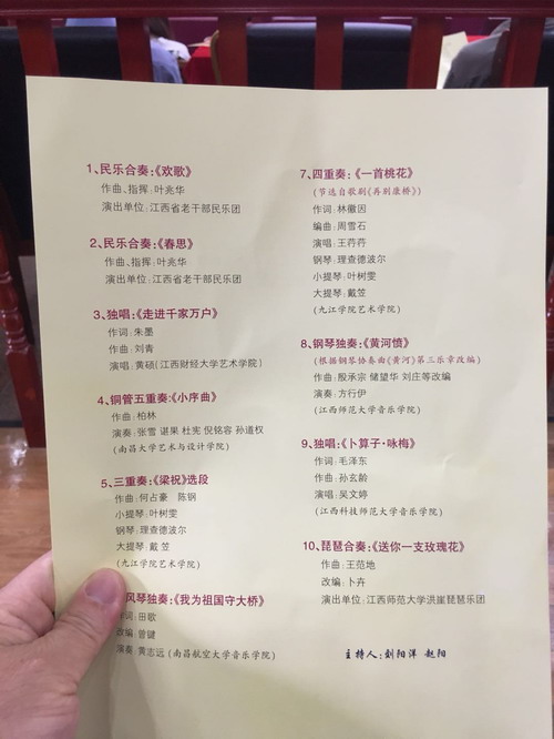 参加音乐会的单位和团体来自江西省老干部艺术团和南昌大学、江西师范大学、江西财经大学、南昌航空大学、江西科技师范大学、九江学院等。节目采用网络直播的形式,内容精湛,体现了较高的艺术水准。我校艺术学院教师表演的三重奏《梁祝》选段、四重奏《一首桃花》得到了在场省文联领导和文艺界同行的高度赞扬。
