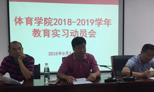 教育实习作为体育教育专业教学培养计划的重要组成部分,是体现理论联系实际原则的重要环节。为保证实习各项工作顺利开展,体育学院领导高度重视,召集教务科、学生科等相关人员、指导老师及全体毕业生在八里湖综合楼621会议室分别于8月30日和9月5日召开了实习动员大会。