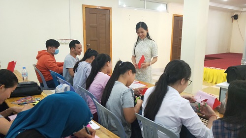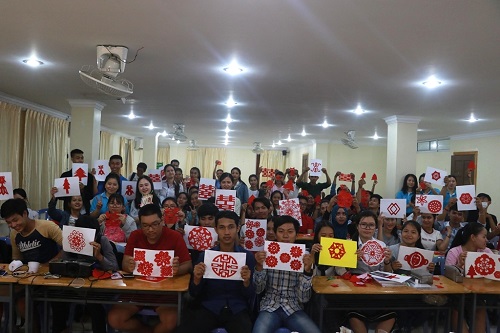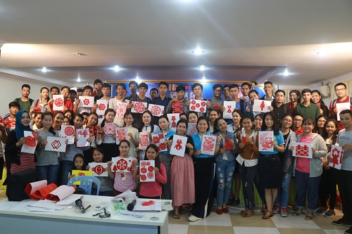 10月17日下午五点,柬埔寨皇家科学院孔子学院金边高棉大学举办了以“九九重阳节 浓浓敬老情”为主题的剪纸活动。柬埔寨皇家科学院孔子学院金边高棉大学负责人刘建玲、公派教师张也,汉语教师志愿者王芳芳、马俊秀、刘青清、杨馥聪、吴立愉与150余名学生参与了此次活动,共同度过了一个别具意义的重阳佳节。