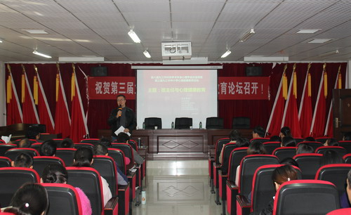 10月27日,由九江学院政法学院、九江市科学技术协会、九江市教育学会、九江市心理学会联合主办的第三届九江市中小学心理健康教育论坛在九江学院八里湖校区政法学院多功能报告厅顺利举行。护理学院党委书记梁光霞、心理咨询中心主任吴燕、九江职业大学心理健康教育与咨询中心主任周伟珍、九江职业技术学院谌海燕教授、江西财经职业学院方卫中教授、九江浔阳晚报记者樊邵红等心理健康教育专家和来自全九江市52所中小学校的70余名中小学心理健康教育的专业教师或班主任以及政法学院心理学专业的学生代表共100余人参加了论坛。