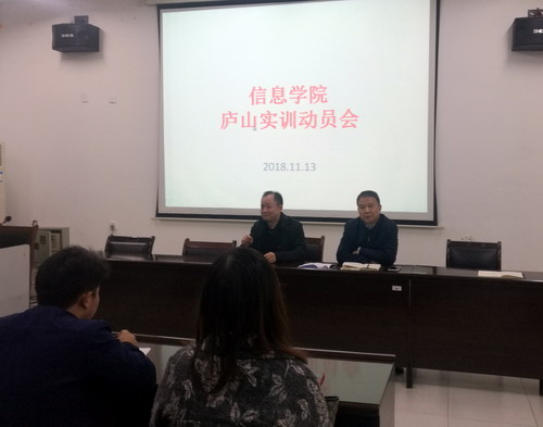 11月13日下午,信息学院在文友楼524会议室召开庐山实训动员会。信息学院院长邓安远,副院长邓长寿,教研科长许志国,带队老师胡芳以及信A1721、信A1722班全体学生参加了会议,会议由副院长邓长寿主持。