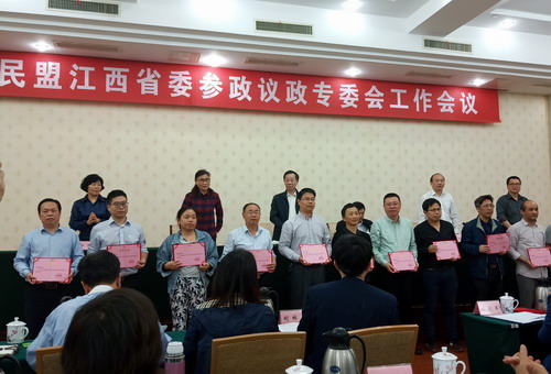 在4月23日举行的民盟江西省委参政议政专委会工作会议上,民盟九江学院委员会主委梅龙宝、盟员李德恩与来自其他地市和单位的16位同志一起被授予“2018年度参政议政专委会优秀委员”称号。