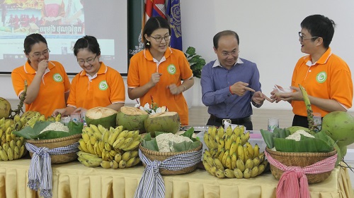 最后进行了吃扁米活动,校长谢索皮先生亲自向老师们示范、指导吃扁米的方法和步骤,使我们汉语教师亲身感受了节日的欢乐和柬埔寨劳动丰收的喜庆。
