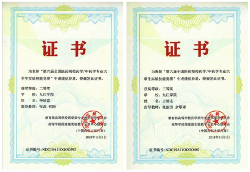 为提高学生实验操作技能,提升学生综合创新能力,2019年10月31日至11月2日,由教育部高等学校药学类专业教学指导委员会、高等学校国家级实验教学示范中心药学学科组、中国药科大学联合举办,河南中医药大学承办的“第六届全国医药院校药学/中药学专业大学生实验技能竞赛”在郑州举行。由张磊、何刚两位老师指导的药学与生命科学学院药学专业A1631班李培霖同学喜获二等奖,由张丽芳、余敬谋两位老师指导的药物制剂专业A1661班占德志同学喜获三等奖。