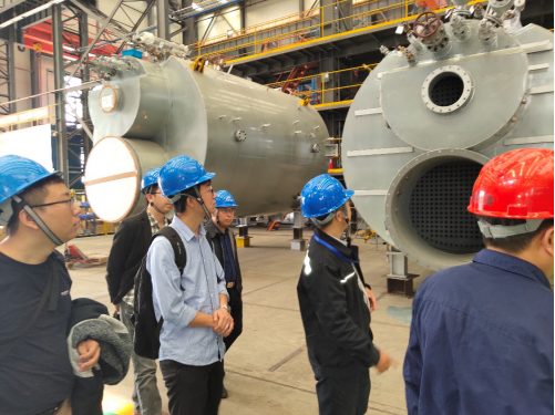 彭教授一行人首先来到九江海天设备有限公司参观成品车间,了解产品的种类、参数及性能。随后到附近的中船锅炉公司参观锅炉和燃烧器车间,仔细了解锅炉的类型及用途。然后来到中船阀门成套设备有限公司,详细了解了多种高性能阀门的工艺参数和用途。