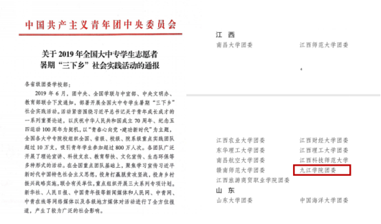 此外,12月30日,省委宣传部、省文明办、团省委、省教育厅、省学联联合发文,对全省三下乡的36个先进单位、168个优秀服务队、300名先进个人、23项优秀调研成果进行通报表扬,我校每个项目均有斩获。学校被评为“2019年江西大中专学生志愿者暑期‘三下乡’社会实践活动先进单位”,校团委爱江护豚服务队、化环学院“美丽中国,我们在行动”暑期三下乡服务队、药生学院赴德安县健康农业调研服务队荣获优秀服务队称号。饶泉等6位老师和黄济富等6名学生被评为“2019年江西大中专学生志愿者暑期‘三下乡’社会实践活动先进个人”。张懿老师指导的《鄱阳湖湖边居民对鄱阳湖中下游干流水系生态环境的分析——以南北港水产场为例》项目被评为优秀调研成果。
