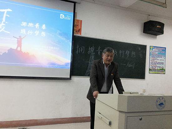 夏启国认真地听着同学们的梦想,不时点头,并与同学们进行了交流。“我对你们是羡慕嫉妒爱”!一句话拉近了与同学们之间的距离,课堂气氛顿时轻松起来。随后,夏启国回忆了41年前自己的大学时代第一次班会的情景,与当时同学们的拘谨相比,夏启国表扬了A2011班同学举止大方、思想活跃。