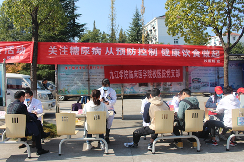 今年11月14日是第14个联合国糖尿病日,宣传的主题为“护士与糖尿病”。11月13日上午,阳光明媚,校医院以“第14届联合国糖尿病日”为契机,组织医护人员和学生唯医服务队员在我校三食堂前开展义诊、宣教活动。此次活动旨在积极引导全校师生关注糖尿病、重视糖尿病,提高教职员工及在校大学生对糖尿病的认识,推进慢病的早期筛查、早期诊断,自觉养成良好的健康行为和生活方式,降低糖尿病发生风险,提高健康水平。