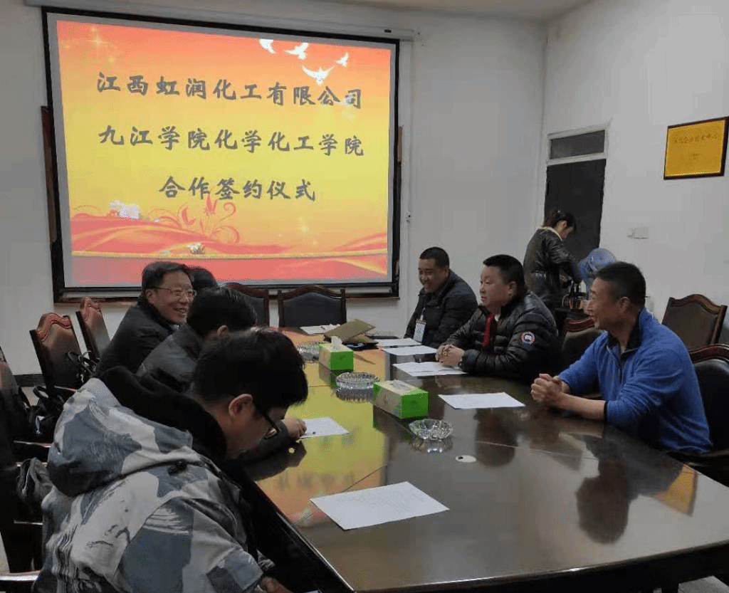 九江市科技局程向阳局长,科技局发展计划科万小平科长,科技局办公室主任杨晋杰,永修县县委常委、统战部陈冬梅部长见证签约。虹润化工总经理李铁斌,副总经理李显平,研发部秦晓春等出席签约仪式。