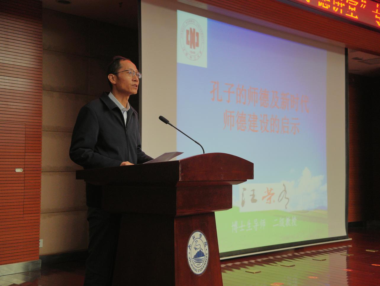 本次讲座特邀江西师范大学二级教授、博士生导师汪荣有作题为《孔子的师德对新时代师德师风建设的启示》的主题报告。近2个小时的分享中,汪荣有以孔子“克己复礼”的修身信念为逻辑起点,逐层阐释“有教无类”的教育情怀、“学而不厌”的治学追求与“诲人不倦”的仁爱坚守,最终以“其身正,不令而行”的师者准则为核心,勾勒出新时代“大先生”的精神画像,为广大教育工作者指明了立德树人的实践方向。