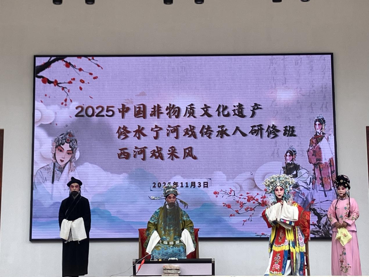 为加强修水宁河戏传承人研修班学员对地方传统戏曲的认识、拓宽他们的视野和提高他们的艺术鉴赏能力,11月3日,研修班师生一行来到庐山市南康古城,对国家级非遗剧种“西河戏 ”进行采风活动。